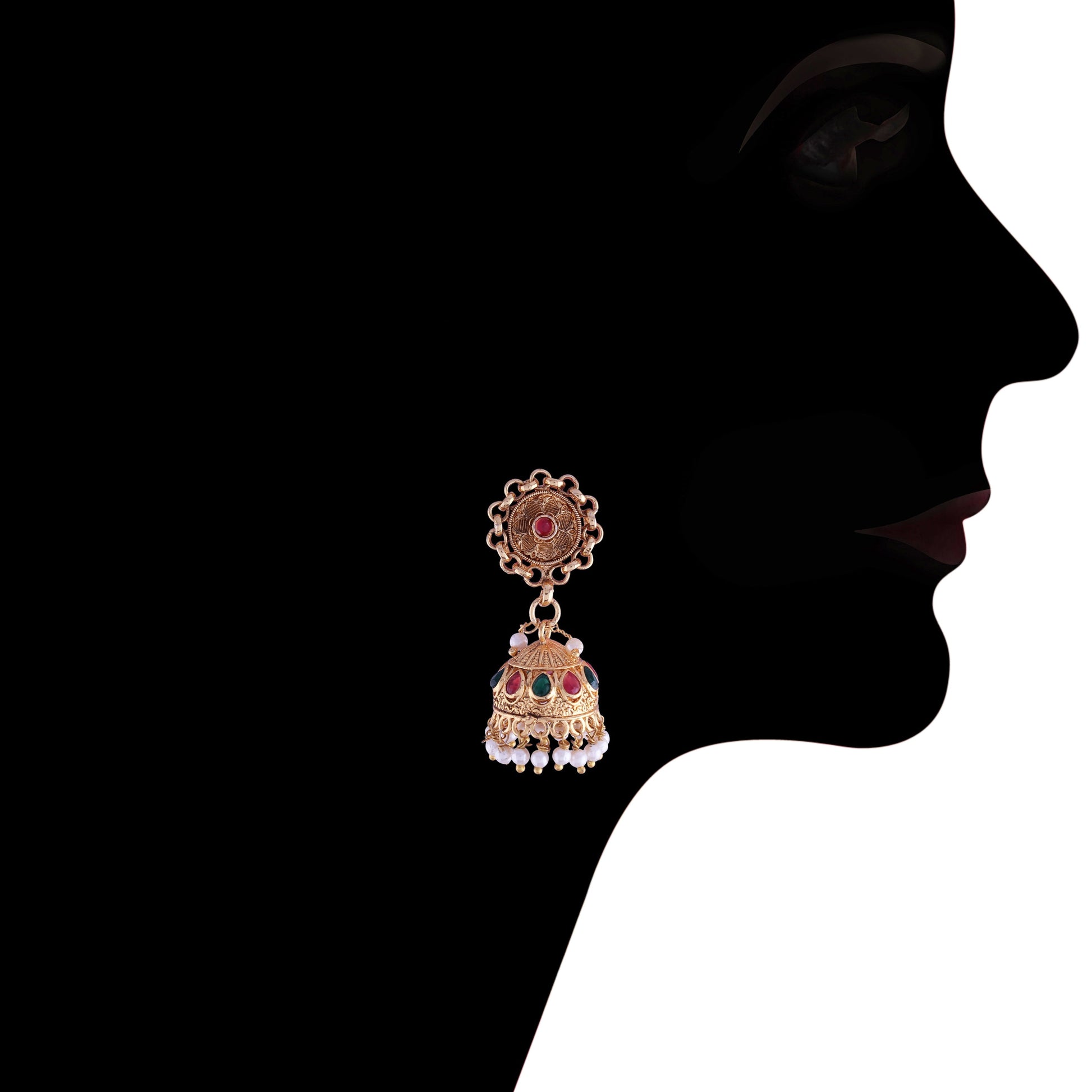 This jewellery set is crafted in 18K gold plating and consists of a choker and a pair of earrings. The necklace feature beads & pearls studded in it and is secured with a drawstring closures. Style this necklace set with a saree or a salwar suit to enhance the look.