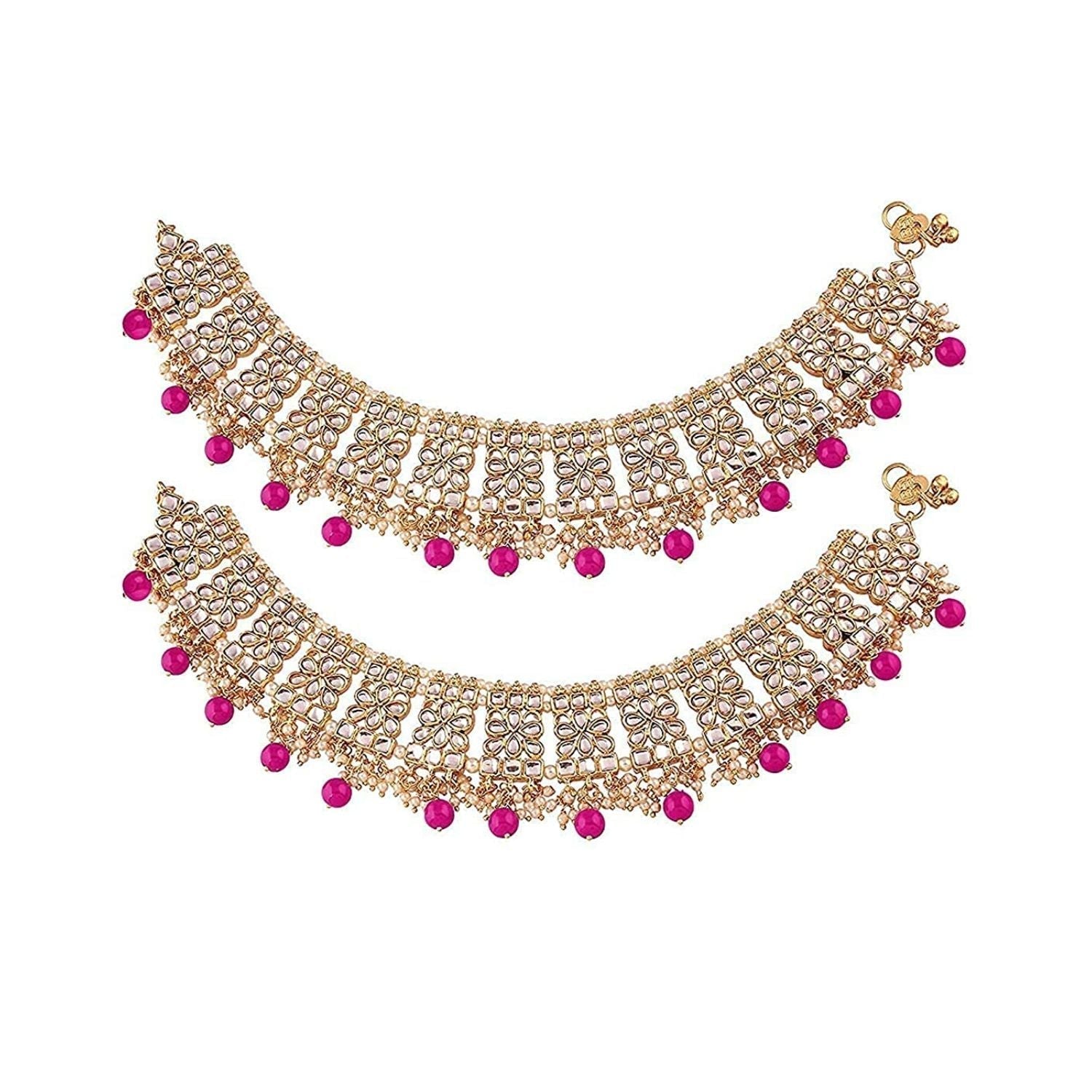 These traditional Kundan stone studded adjustable anklets for women are a perfect combination of elegance and tradition. The anklets are adorned with Kundan stones, which are traditional Indian gems that add a touch of glamour to the design. They are handcrafted by skilled artisans with attention to detail, ensuring that each anklet is unique and of high quality. The anklets come with an adjustable chain that can be adjusted to fit most sizes, making them easy to wear for women of different ages and sizes. They feature a traditional Indian design that makes them perfect for weddings, parties, and other cultural occasions. The anklets are made of high-quality materials that ensure durability and longevity, so they can be worn for years to come. These anklets are lightweight and comfortable to wear, making them perfect for extended use during special occasions. They also feature stone studded charms that add a beautiful finishing touch to the design. These anklets are versatile and can be paired with traditional Indian attire or modern outfits, making them a great addition to any jewelry collection.