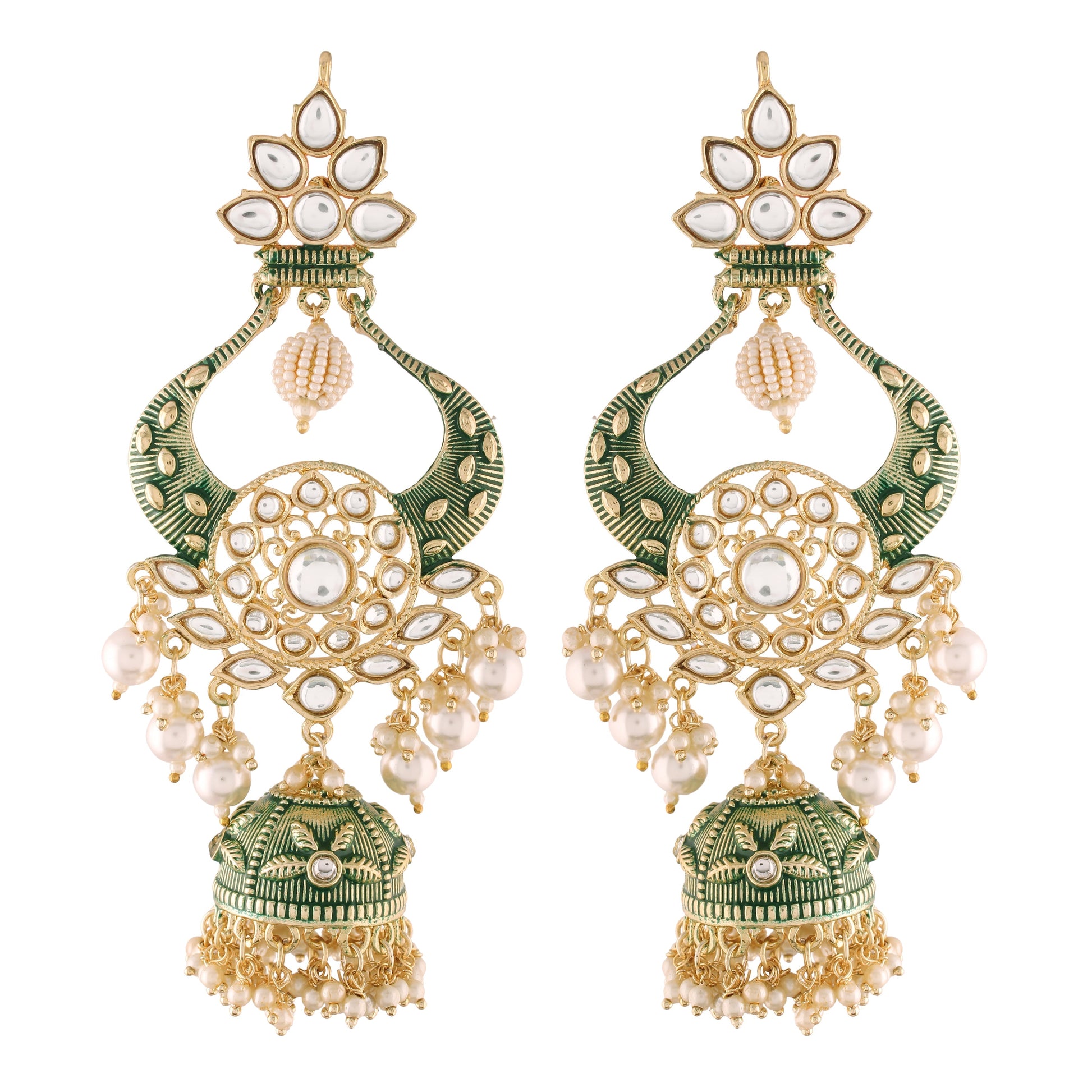 18K Gold Plated Intricately Designed Traditional Green Enamel Glided With Kundans & Pearls Jumka Earrings For Women - Wahe Jewels