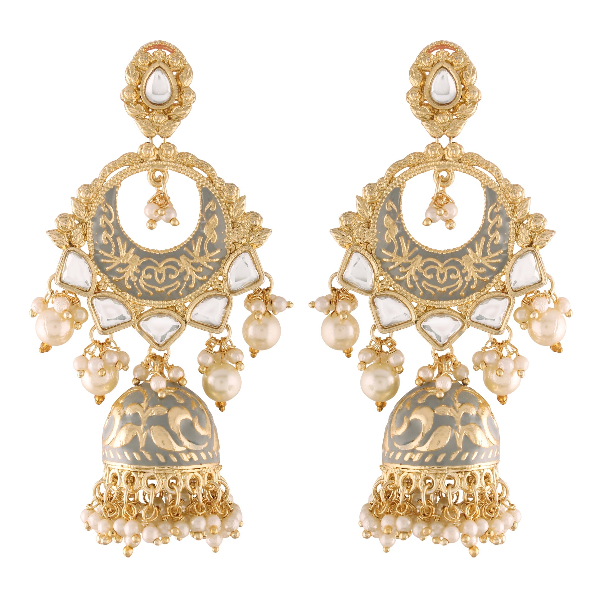 18K Gold Plated Intricately Designed Traditional Grey Enamel Glided With Kundans & Pearls Jhumki Earrings For Women - Wahe Jewels