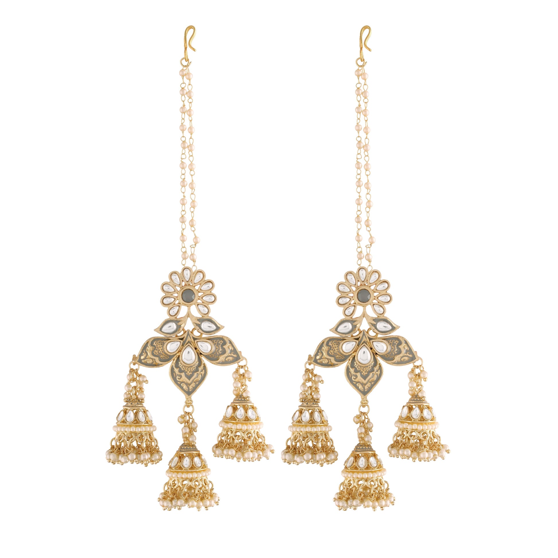 18K Gold Plated Intricately Designed Traditional with Detachable Hair Chain Encased With Kundans & Pearls Jumka Earrings For Women - Wahe Jewels